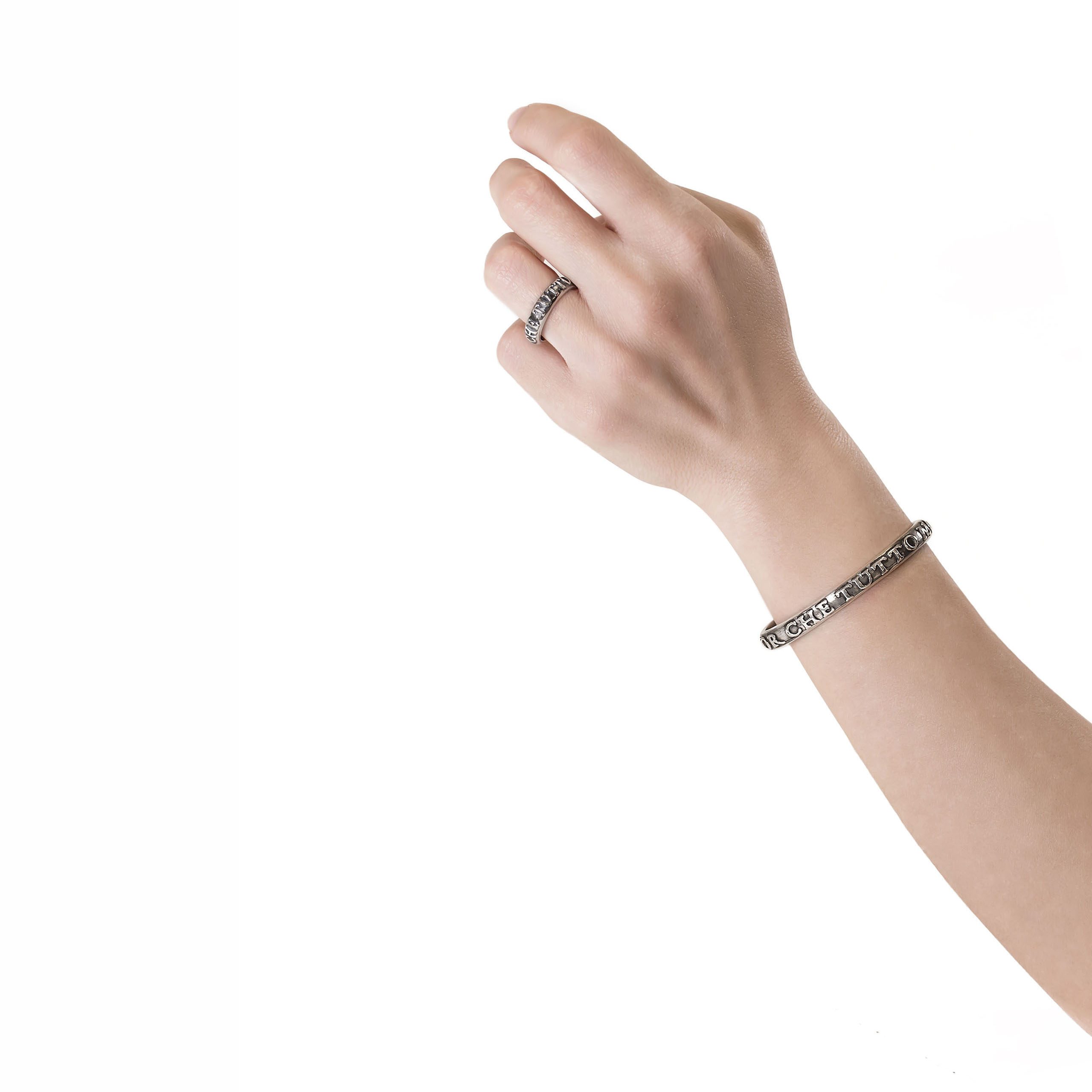 Manual skills above technology, this is what Coreterno jewelry is all about, through the recovery of ancient traditions that have their roots in ancient Rome, hand-beaten metal, engraving, live fire forging. Jewels which make the hand of the artist who created them perceivable, imperfect and unique as the essence of man himself. Engraved and bas-relief words that express the intellect, the poetry of the human being and his ability to create his own destiny.