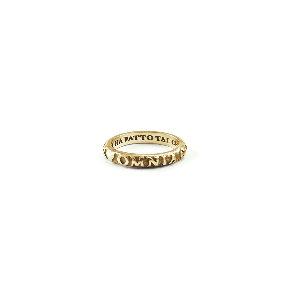 The inside of the ring is adorned with the profound words “AMOR HA FATTO TAL CH’IO VIVO IN FOCO” (Love Has Made Me So I Burn In Fire). Translated from the poetic language of Gaspara Stampa, one of Italy’s greatest female poets from the 16th century, this powerful line ignites the flames of passion and encapsulates the intensity of love’s embrace.